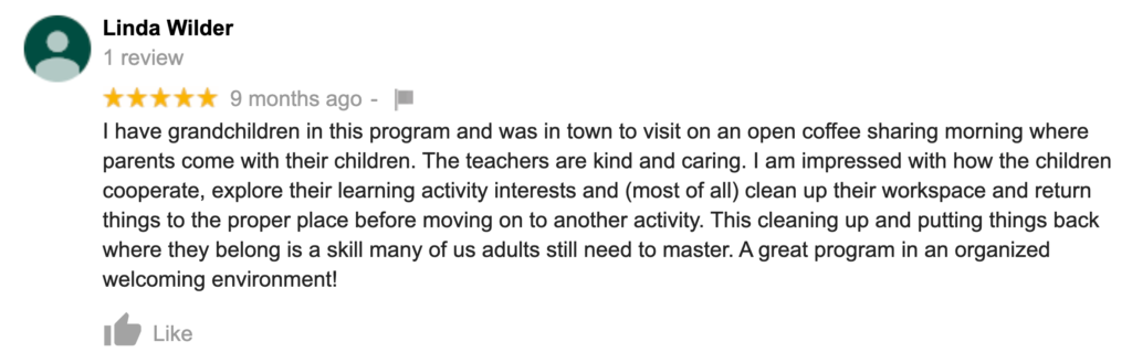 The children enjoy free flow play and work time while parents enjoy face to face connections with teachers and other parents and even receive some lessons from their own kiddos.