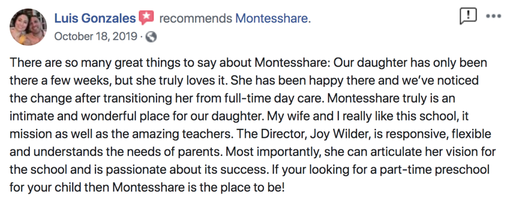 At Montesshare our commitment to the Montessori method, originally dubbed The Scientific Method of Education, is the foundation of our program. Our priority is to offer a high quality, Spanish infused environment where your child’s sense of order will be as nurtured as his sense of wonder. We create an environment where concentration and coordination are more valued than her compliance. Learning begins with relationship; our children’s house offers the best of intimacy and individualization.